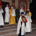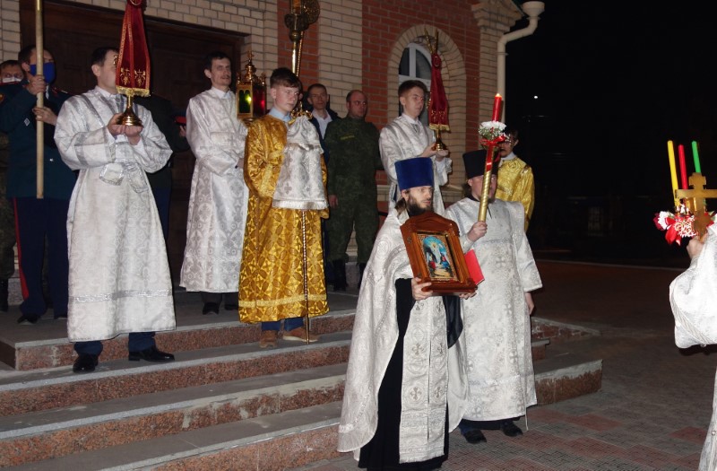 Перед самой полуночью торжественный благовест возвестил о наступлении великой минуты Светоносного Праздника Воскресения Христова. Владыка и иерей Антоний с Крестом, светильниками и фимиамом вышли из алтаря и вместе с певчими подобно мироносицам, ходившим рано ко Гробу, обошли вокруг собора с пением: «Воскресение Твое, Христе Спасе, Ангели поют на небесех…»