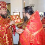 На малом входе Владыка удостоил протоиерея Андрея Гусева Патриаршей награды — правом ношения палицы.