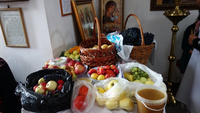 По завершении Литургии состоялся молебен на освящение плодов нового урожая: яблок, винограда и «начатков овощей».