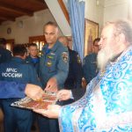 После беседы был отслужен краткий молебен, после чего батюшка окропил всех присутствующих святой водой, поздравил всех с нашим общим праздником и в память об этой встрече раздал небольшие иконки. Проводил батюшка работников МЧС колокольным звоном.