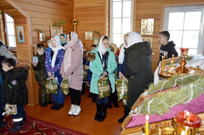 Ученики воскресной школы поздравили прихожан праздничными песнопениями и стихами. И по традиции каждый ребенок прихода получил рождественский подарок.