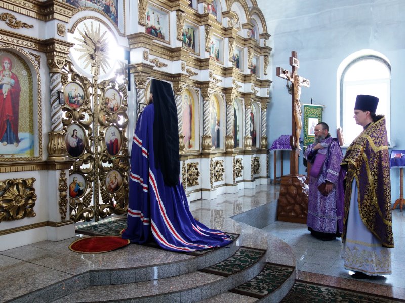 По завершении Литургии состоялось славление Животворящему Кресту Господню. Накануне за всенощным бдением было совершено торжественное изнесение Креста Господня, украшенного цветами, из алтаря в центр храма.