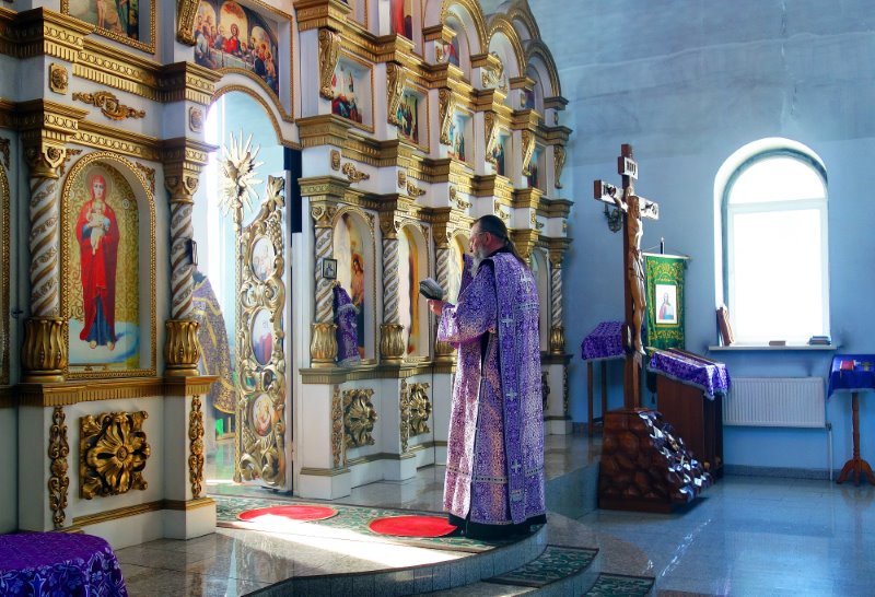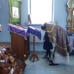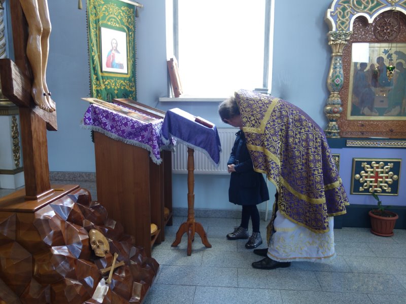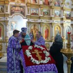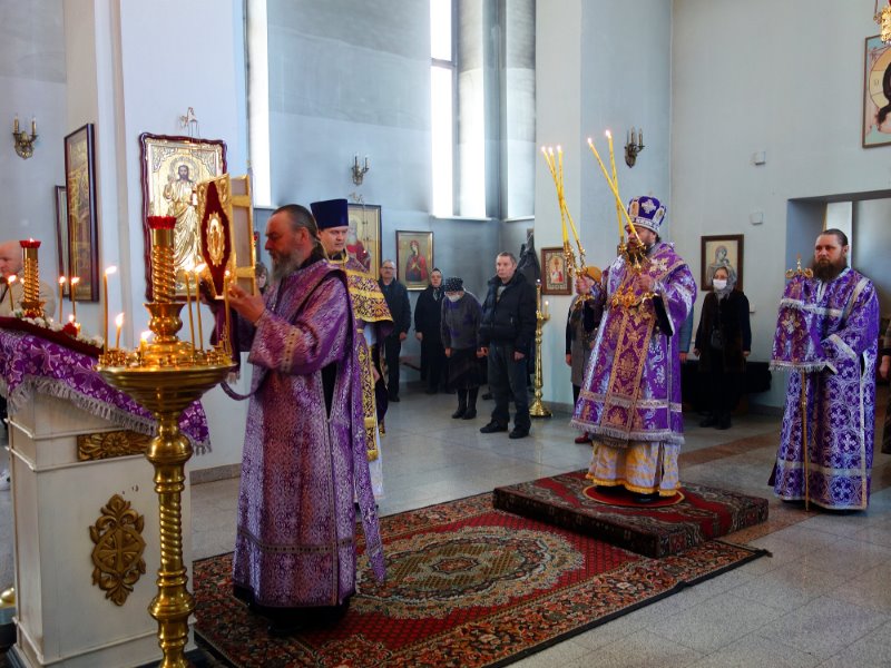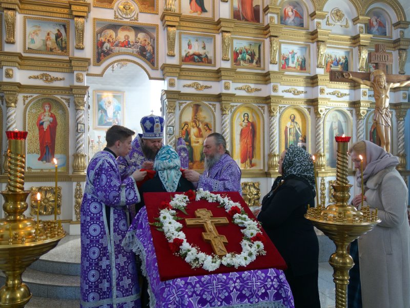 Владыка отметил, что Крест Христов вынесен на аналое в центр храма на поклонение для того, чтобы подбодрить молящихся и укрепить их стремление и дух к дальнейшему пощению, духовно утешить верующих и поддержать их в несении подвига поста в период преполовения Великого поста — начавшуюся вторую половину Святой Четыредесятницы, когда силы начинают ослабевать.