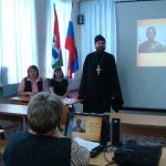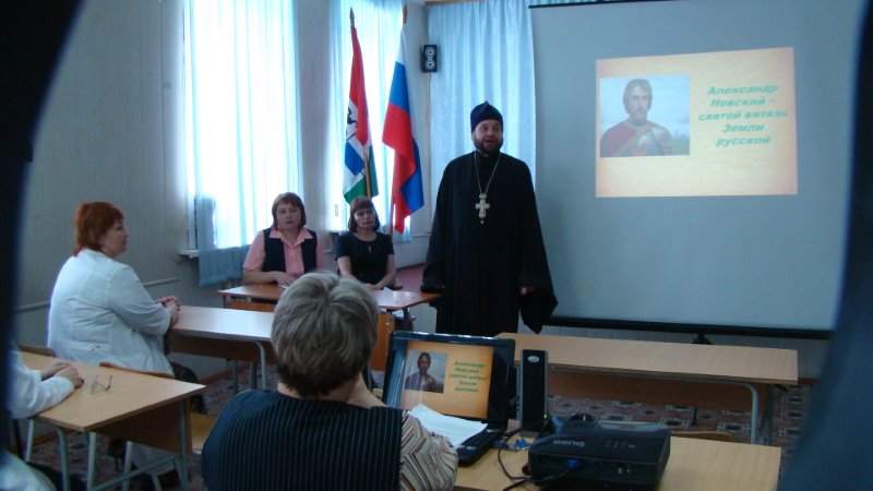 Иеромонах Мелхиседек обратился с докладом на тему «Александр Невский: Запад и Восток, историческая память народа» и рассказал о том, что в с. Барабо-Юдино Чистоозерного района Карасукской епархии находится храм во имя св. благоверного великого князя Александра Невского, в котором 26 мая, в день знаменательной даты — празднования 800-летия со дня рождения святого благоверного князя, завершится Крестный ход со святынями, который проходит по приходам Карасукской епархии, и по благословению управляющего Карасукской епархии Владыки Филиппа состоится Божественная литургия, которую возглавит Его Преосвященство епископ Филипп соборно со священнослужителями Карасукской епархии. Далее батюшка ответил на вопросы студентов.