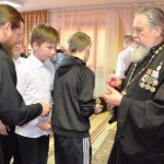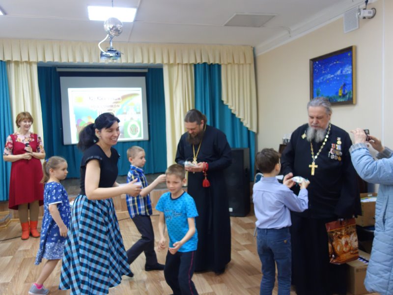 Владыка вместе с протоиереем Александром Гришином и игуменом Гурием (Прокичевым) подарил детям на память сладкие пасхальные подарки и иконочки.