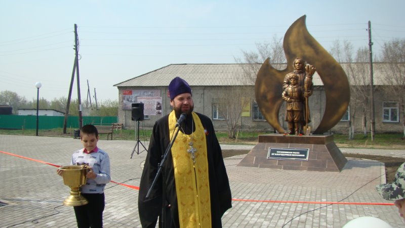 В 12.00 все жители города собрались на открытие мемориала Труженикам тыла, который установили недалеко от храма во имя св. апостола и евангелиста Луки. И что символично: он установлен рядом с тем местом, где в годы войны находился военкомат, откуда жители Купинского района уходили на войну.
