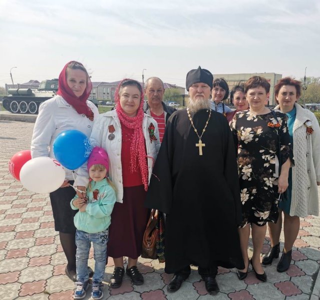 Затем настоятель и прихожане прошли к Монументу Славы — на центральную площадь с. Багана, где состоялся митинг и возложение цветов к памятнику погибшим воинам.