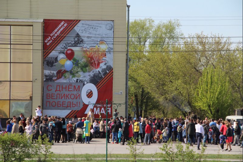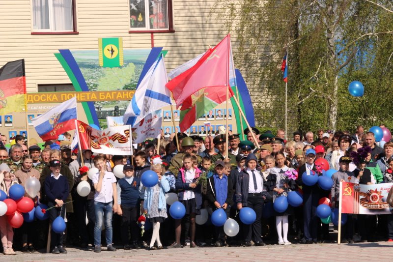 На центральной площади собралось много баганцев с цветами, волонтеры ДОО «Олимп Баганского района НСО» и лидеры местного отделения Российского движения школьников Баганского района раздавали всем присутствующим георгиевские ленточки, как символ праздника, символ нашего уважения к людям, победившим в этой ужасной войне, символ уважения и памяти к павшим.