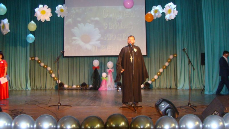 Затем в районном Дворце Культуры состоялось праздничное мероприятие, на котором чествовались семьи, прожившие вместе 15 лет и более. Иеромонах Мелхиседек поздравил всех присутствующих с церковно-государственным праздником — Днем семьи, любви и верности, пожелал чтобы молодое поколение воспитывалось на своих исконно русских традициях, знало семейные ценности, понимало святость брака на примере наших русских святых — благоверных князя Петра и княгини Февронии, Муромских чудотворцев.