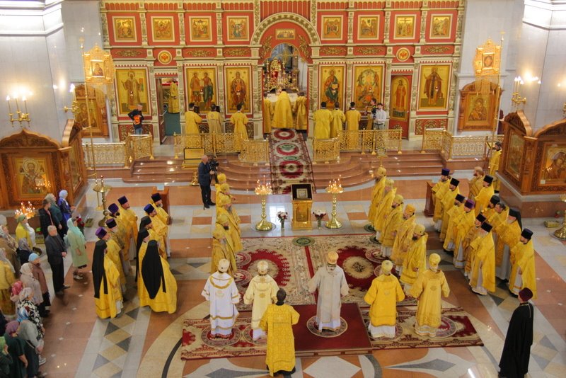 Его Высокопреосвященству сослужили митрополит Астраханский и Камызякский Никон, митрополит Барнаульский и Алтайский Сергий, архиепископ Карагандинский и Шахтинский Севастиан, архиепископ Салехардский и Ново-Уренгойский Николай, архиепископ Егорьевский Матфей, викарий Святейшего Патриарха Московского и всея Руси, епископ Арсеньевский и Дальнегорский Гурий, епископ Ейский и Тимашевский Павел, епископ Карасукский и Ордынский Филипп, епископ Нижнетагильский и Невьянский Феодосий, епископ Искитимский и Черепановский Лука, епископ Армавирский и Лабинский Василий, епископ Ванинский и Переясловский Аристарх, епископ Амурский и Чегдомынский Николай, епископ Николаевский и Богородский Иннокентий, секретарь епархиального управления иеромонах Николай (Белозеров), настоятель Спасо-Преображенского собора протоиерей Георгий Сивков, духовенство епархии.