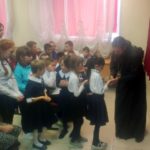 Владыка также провел с детьми духовную беседу, благословил их на хорошую учебу, окропил святой водой и раздал детям сладкие подарки и нательные крестики.