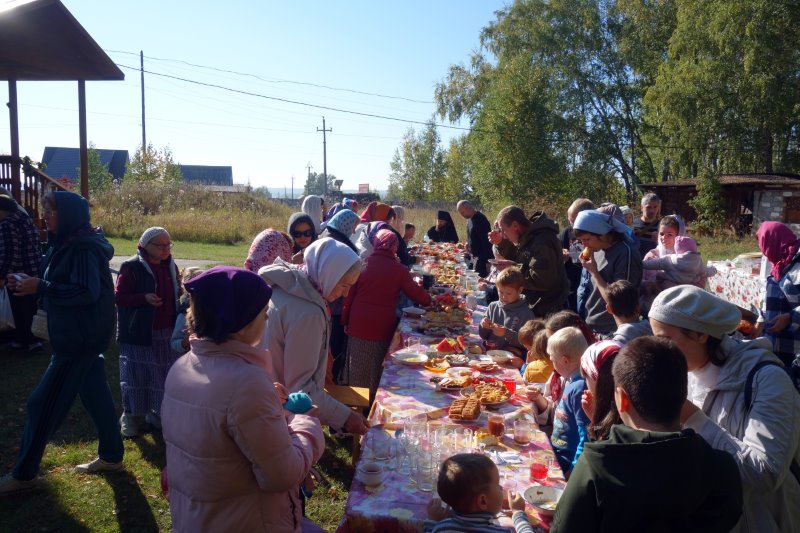По окончании торжественного богослужения всех пригласили за празднично накрытый стол, установленный на прихрамовой территории, прямо под открытым небом. Было тепло, радостно и солнечно!