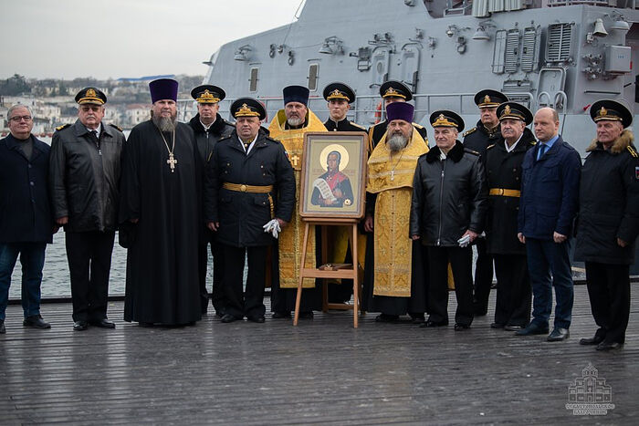 После этого катер под флагом командующего ЧФ совершил обход мест стоянки кораблей с походной иконой святого праведного воина Феодора Ушакова.