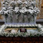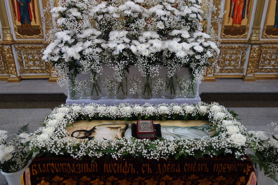 По завершении молитвенного шествия Его Преосвященство с клириками собора поднесли Плащаницу к открытым Царским вратам в знак того, что Спаситель неразлучно пребывает с Богом Отцом и что Он своими крестными страданиями и смертью снова открыл нам двери рая и возложили ее на место посреди собора.