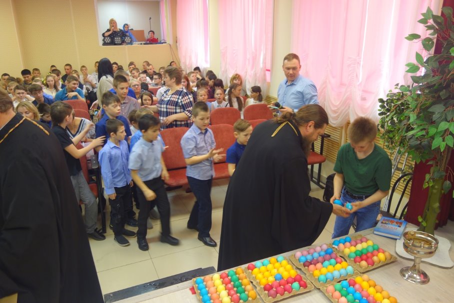 Дети подготовили Пасхальный концерт. Владыка прочитал вместе с ними молитву «Отче наш», рассказал им о светлом празднике Святой Пасхи и окропил всех святой водой. В школе царила теплая атмосфера, было по-домашнему уютно.