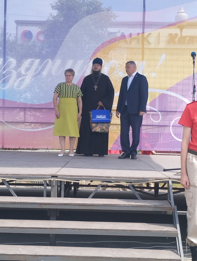 Глава района Луцкий Богдан Вячеславович поблагодарил прихожан и вручил настоятелю прихода протоиерею Андрею Гусеву благодарственное письмо и памятный подарок.