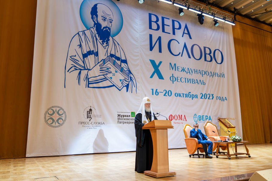 «Мы сердечно Вас приветствуем на юбилейном X фестивале «Вера и слово», международном фестивале, проходящем по Вашему благословению. Ваше Святейшество, у нас в зале примерно 500 человек из 200 епархий Русской Православной Церкви, 9 стран пастырской ответственности Русской Православной Церкви, а также наши гости — представители светских СМИ, органов государственной власти, общественных организаций — и все с надеждой, радостью и волнением ждут Вашего слова», — сказал В.Р. Легойда.